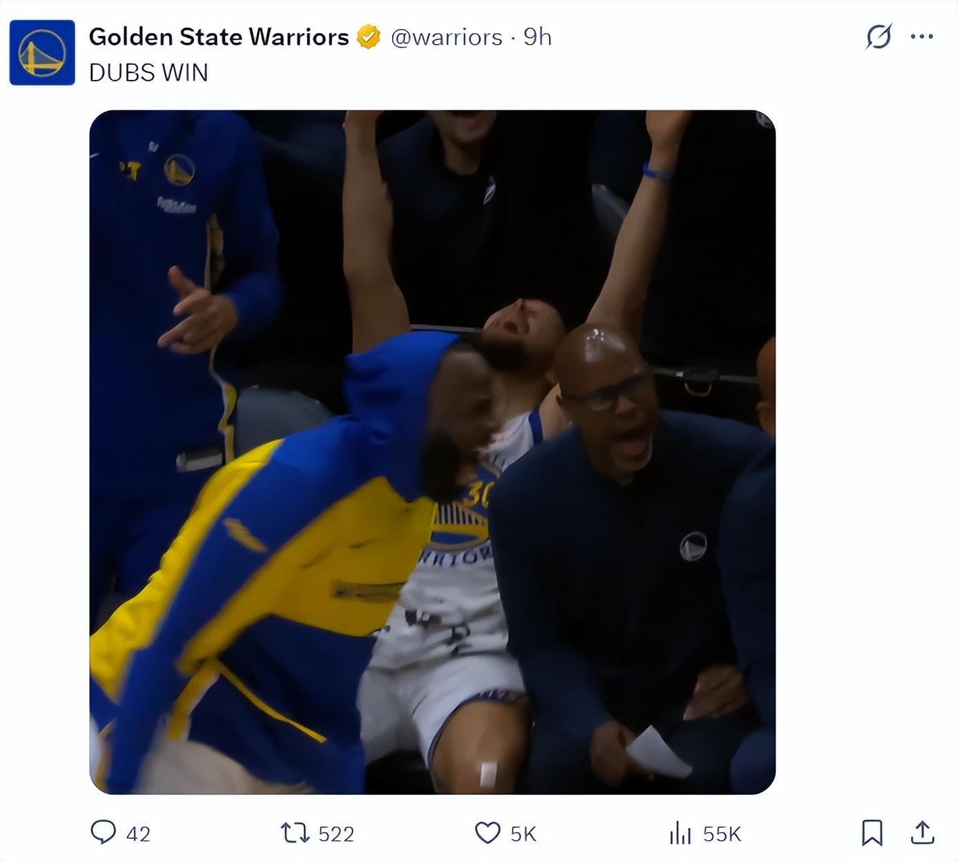 北京时间1月26日,勇士111-85大胜森林狼送给对手五连败。这场比赛是延期进行的,上半场两队还算胶着,可第三节勇三疯再现单节38-17直接打崩森林狼,末节库里仅打了5分钟就打卡下班了。库里末节仅登场5分钟,4中2+三分2中1+罚球4中4拿到9分后就被科尔换下休息,因为两队的分差过大,库里也在场下疯狂的为队友呐喊打Call,当队友命中三分球时他再一次双手举天...